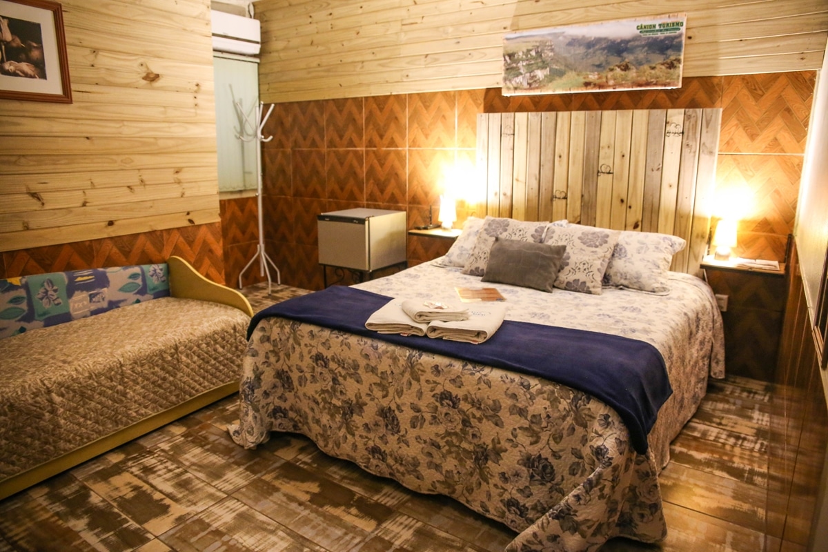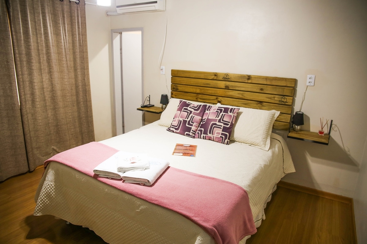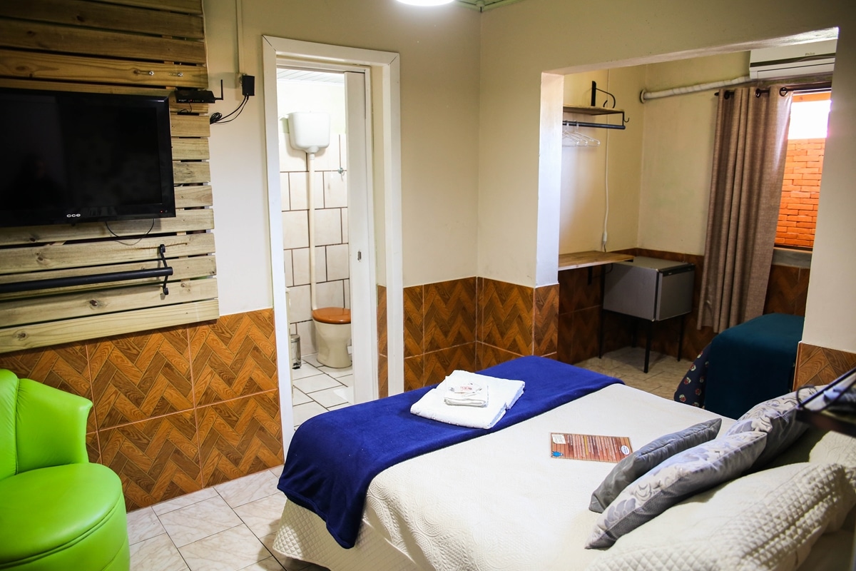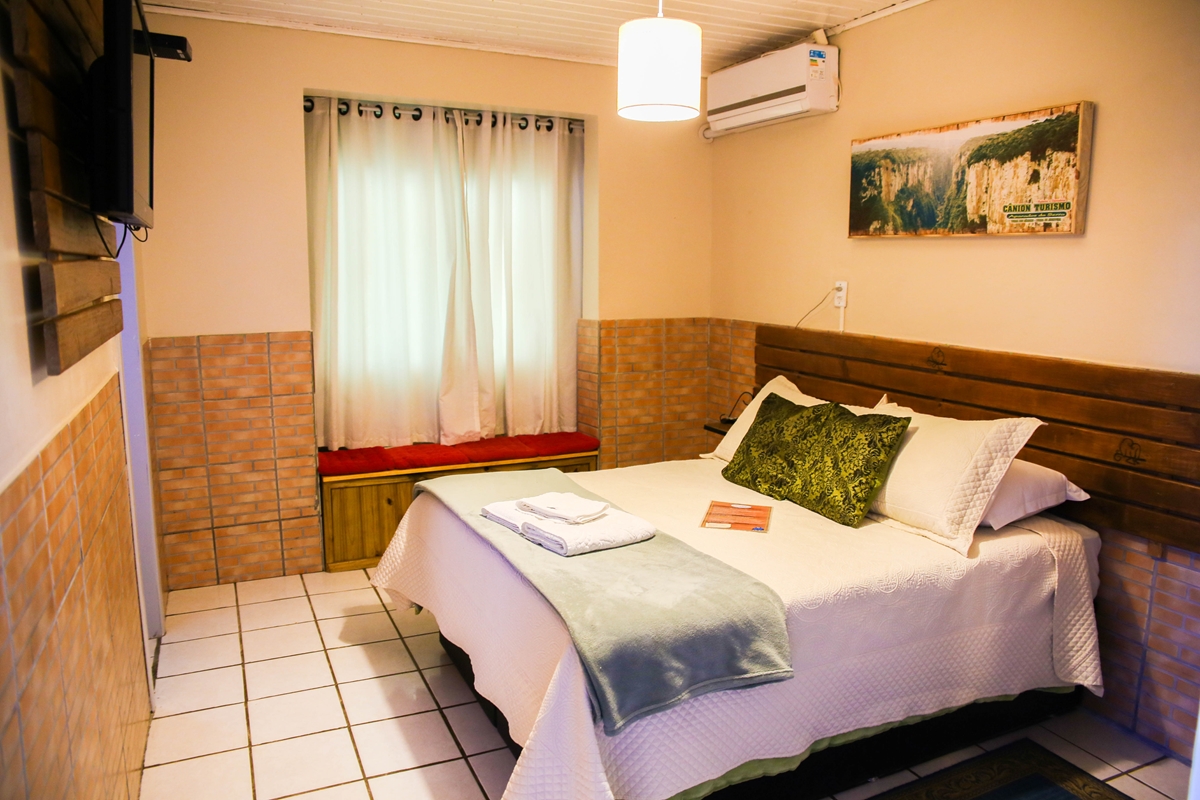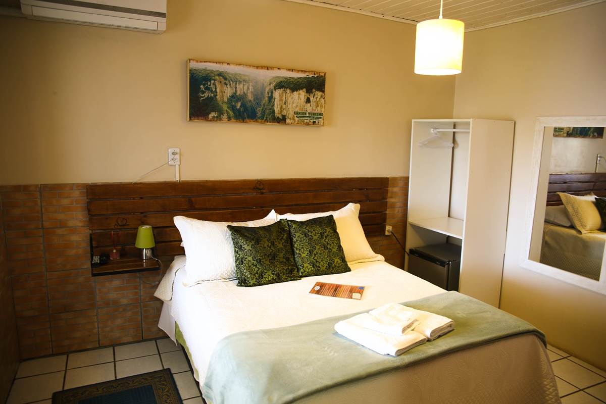 Suítes com banheiro privativo, ar condicionado quente/frio, frigobar, cama box, tv Led com receptor de canais por assinatura.